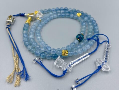 This is a whisper of blue — 108 beads of 8mm blue fluorite, accented with phantom and clear quartz. Element: Water; Throat Chakra: calm and clarity for confident expression. Held in the palm it feels cool like a stream; in the light it unfolds like a tiny landscape scroll. Not just jewelry — a talisman that helps you speak your truth. 📿