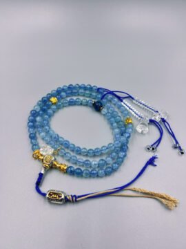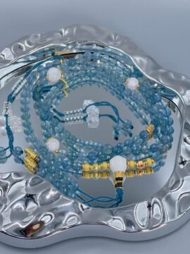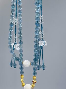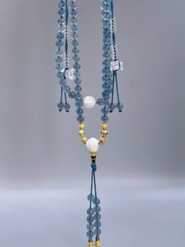 Blue light gliding through your fingertips — at once a calming stream and a steady ridge of resolve. Crafted from 108 beads of 8mm blue fluorite, accented with white phantom beads and clear quartz, this piece converts effortlessly between a wrap bracelet and a formal mala. Its element is Water and it resonates with the Throat Chakra — grounding your calm while amplifying your voice, helping what’s inside you be heard with clarity.